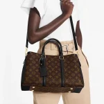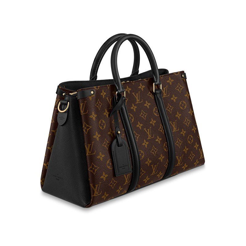 An elegant choice for city wear this edition of the Soufflot MM in supple Monogram canvas is richly accented with colored leather gussets and trim. The lateral bands and name tag nod to the Keepall a House icon since 1934. Articulated top handles and a long adjustable strap afford multiple carry options while the coordinated colored lining adds refinement.