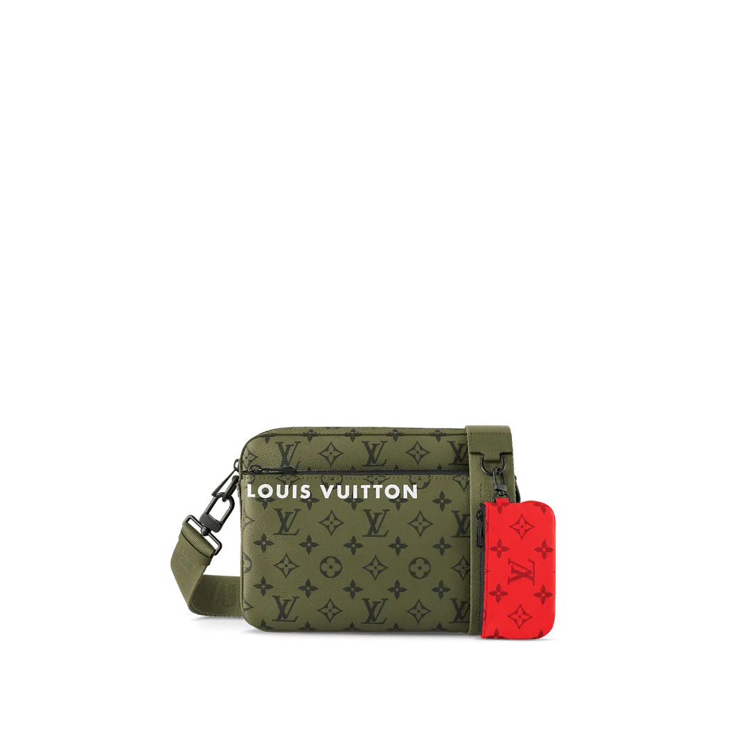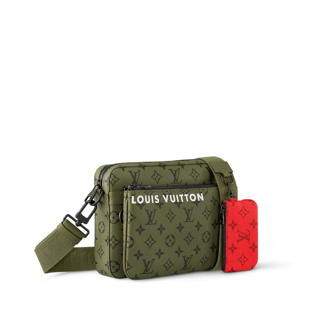 Three accessories in one the Trio Messenger bag is composed of a removable coin purse a main compartment and a detachable front zipped pocket that can be removed and used separately. Crafted from green and red Monogram coated canvas it comes with a detachable and adjustable textile strap to which the coin purse is attached.