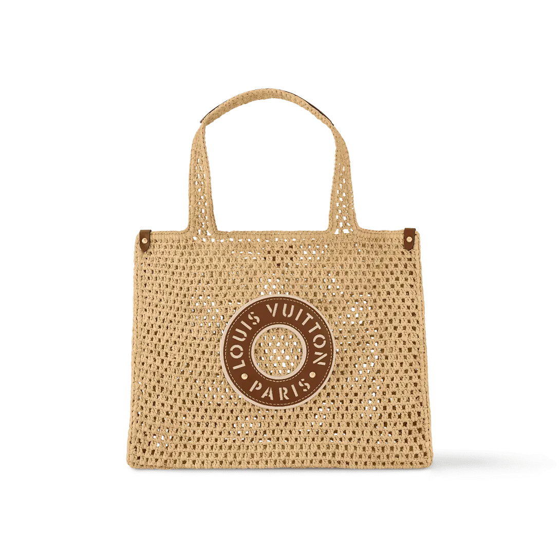 As part of the LV By The Pool Collection the OnTheGo MM tote is made from hand-crocheted 100% natural raffia. The riveted corners are in cowhide leather as is the circular “Louis Vuitton Paris” patch on the front. The OnTheGo MM can fit 13-inch laptop and a beach towel as well other essentials.