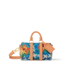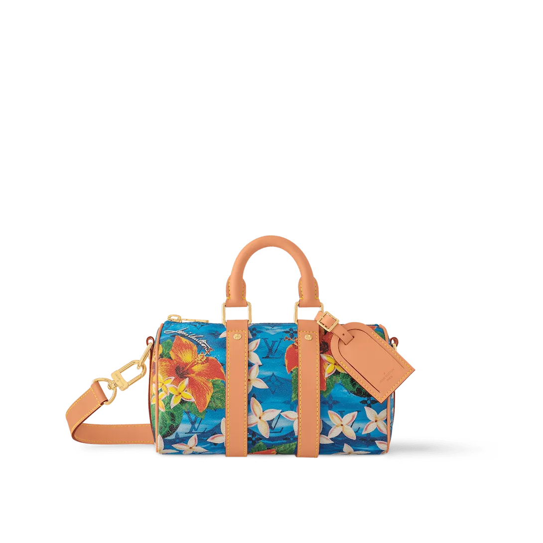 The Keepall Bandoulière 25 is a smaller version of Louis Vuitton’s famous Keepall travel bag. It’s made from Pharrell Williams’ Monogram Surfin’ canvas with its intricate print combining different summery motifs. The bag’s design and tropical print give this city bag a vintage feel. A detachable strap and two rolled-leather top handles enable carry options.