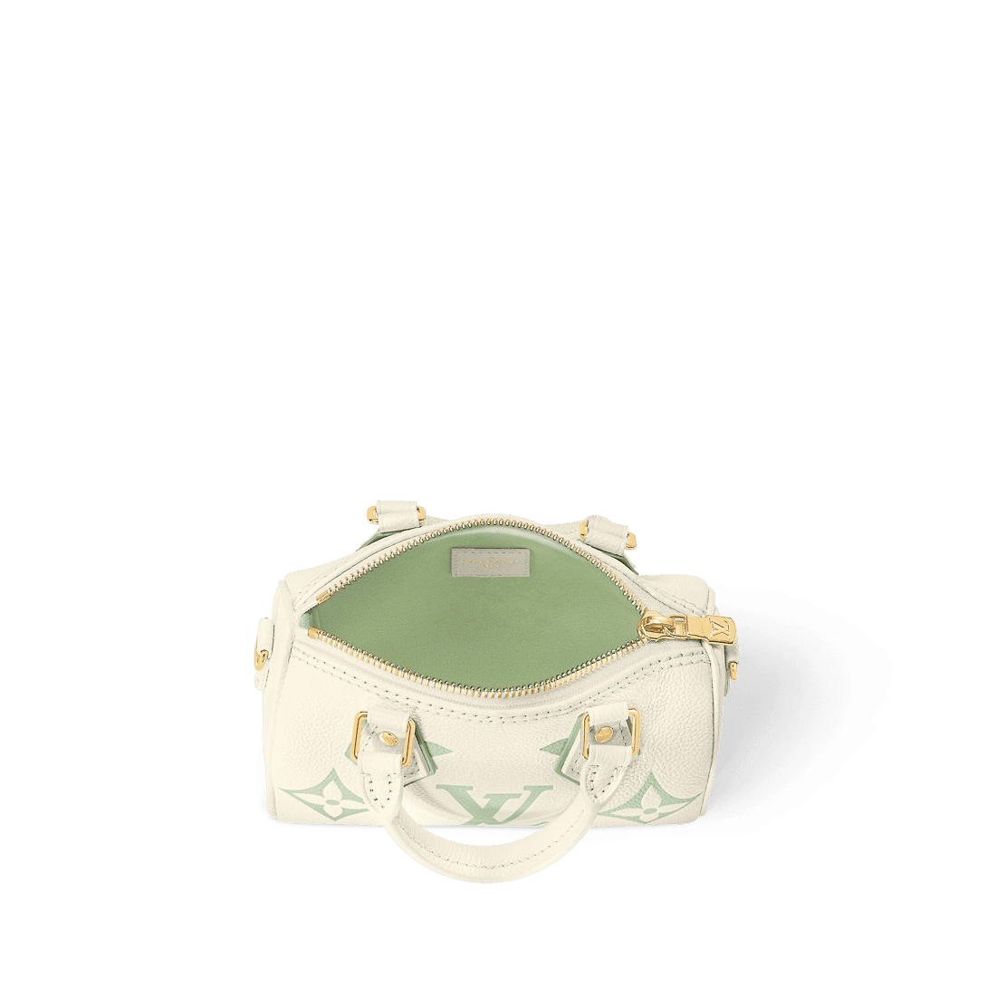 The Nano Speedy bag is revisited in supple grained Monogram Empreinte leather in a fresh bicolor palette that highlights the embossed Monogram pattern. This mini replica of the iconic Speedy comes with two handles and a removable gold-tone chain which is interlaced with leather offering a refined look and different carry options.