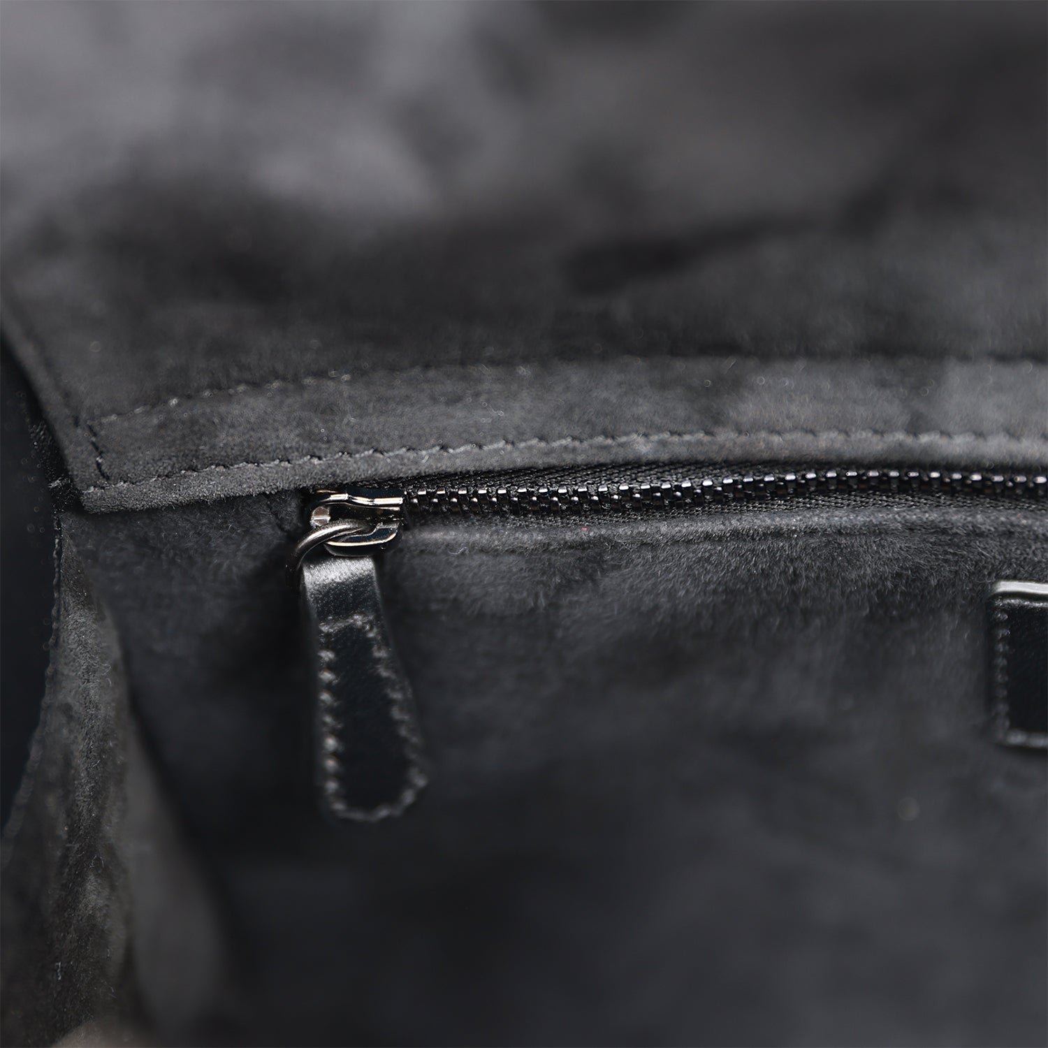 The interior is lined in black fabric and has one pocket and one zip pocket on the rear wall.
