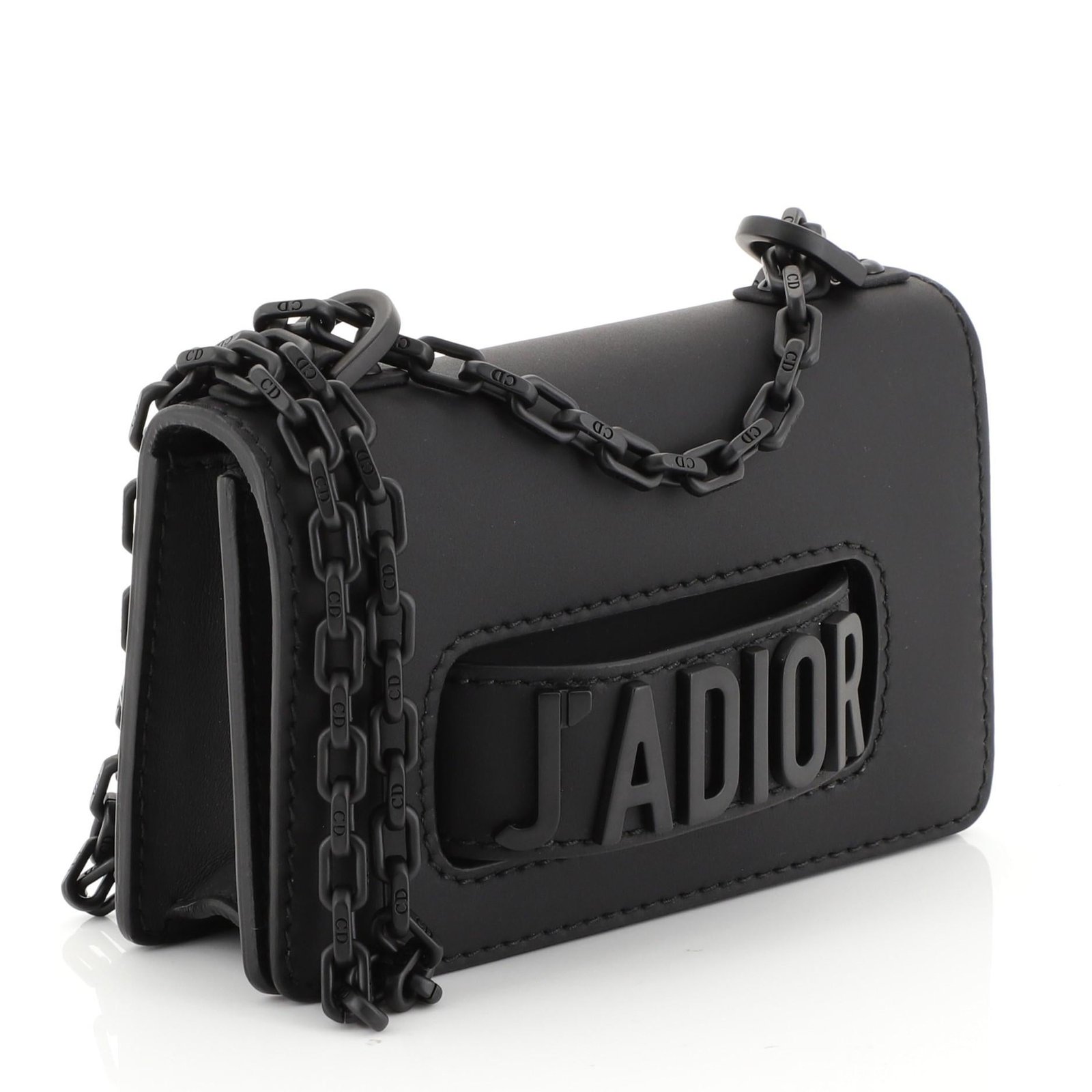 This Christian Dior Ultra Matte J’adior Flap Bag Matte Calfskin Mini, crafted from black calfskin leather, features a chain link strap, slot handclasp, and matte black-tone hardware. Its flap opens to a black microfiber interior with a slip pocket.