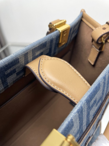 采用浅蓝色牛仔布制成,带有 FF 图案、米色皮革“Fendi Roma”字样和米色皮革管状手柄。
