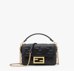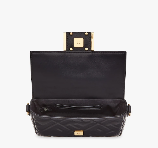 Iconic mini Baguette bag made of black soft nappa leather with a three-dimensional texture FF motif. Decorated with an FF clasp.