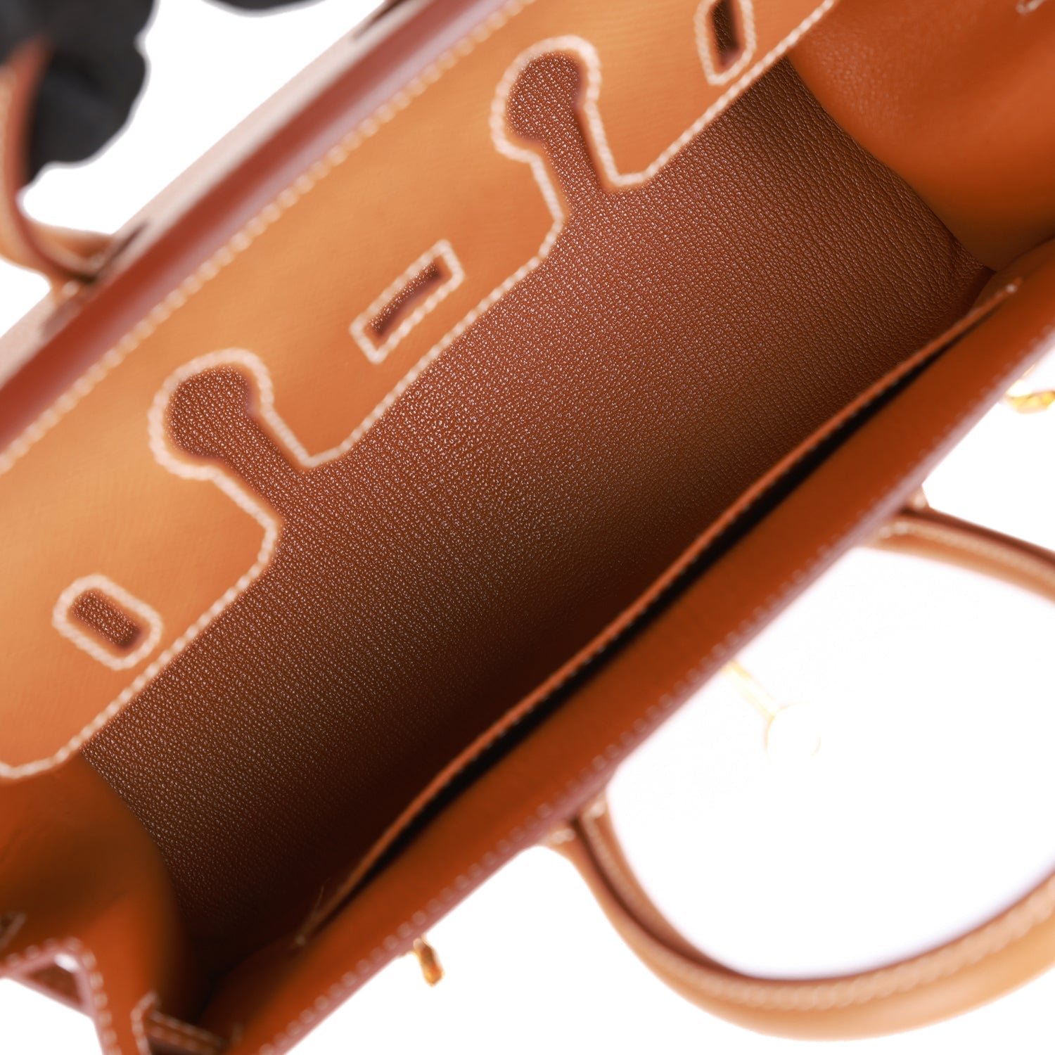 The interior is lined with gold chevre and has one zip pocket with an Hermes engraved zipper pull and an open pocket on the opposite side.