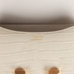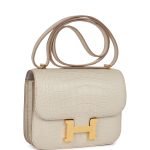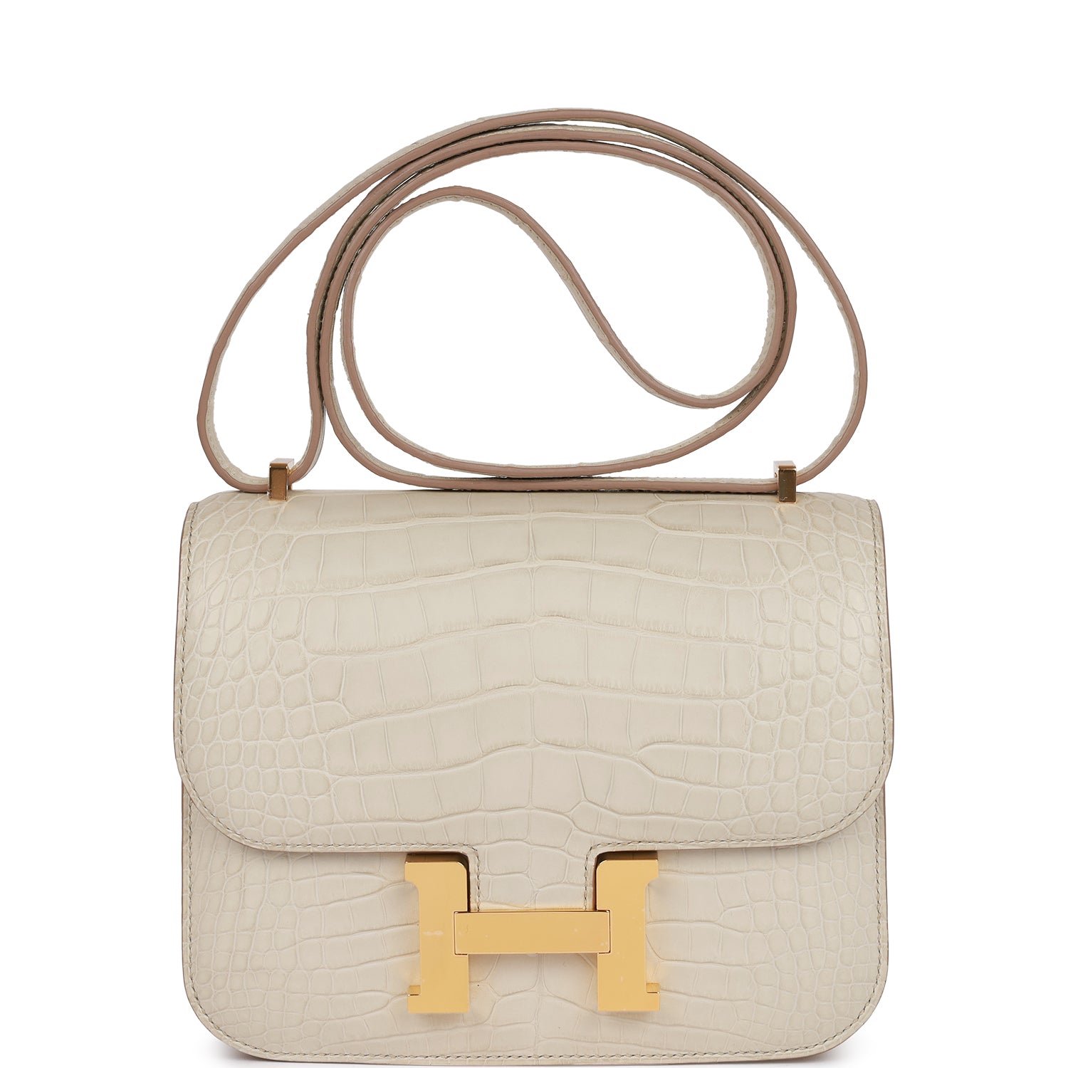 This Constance is of Beton matte alligator with gold hardware and features tonal stitching. a H snap lock closure. and an adjustable shoulder strap.