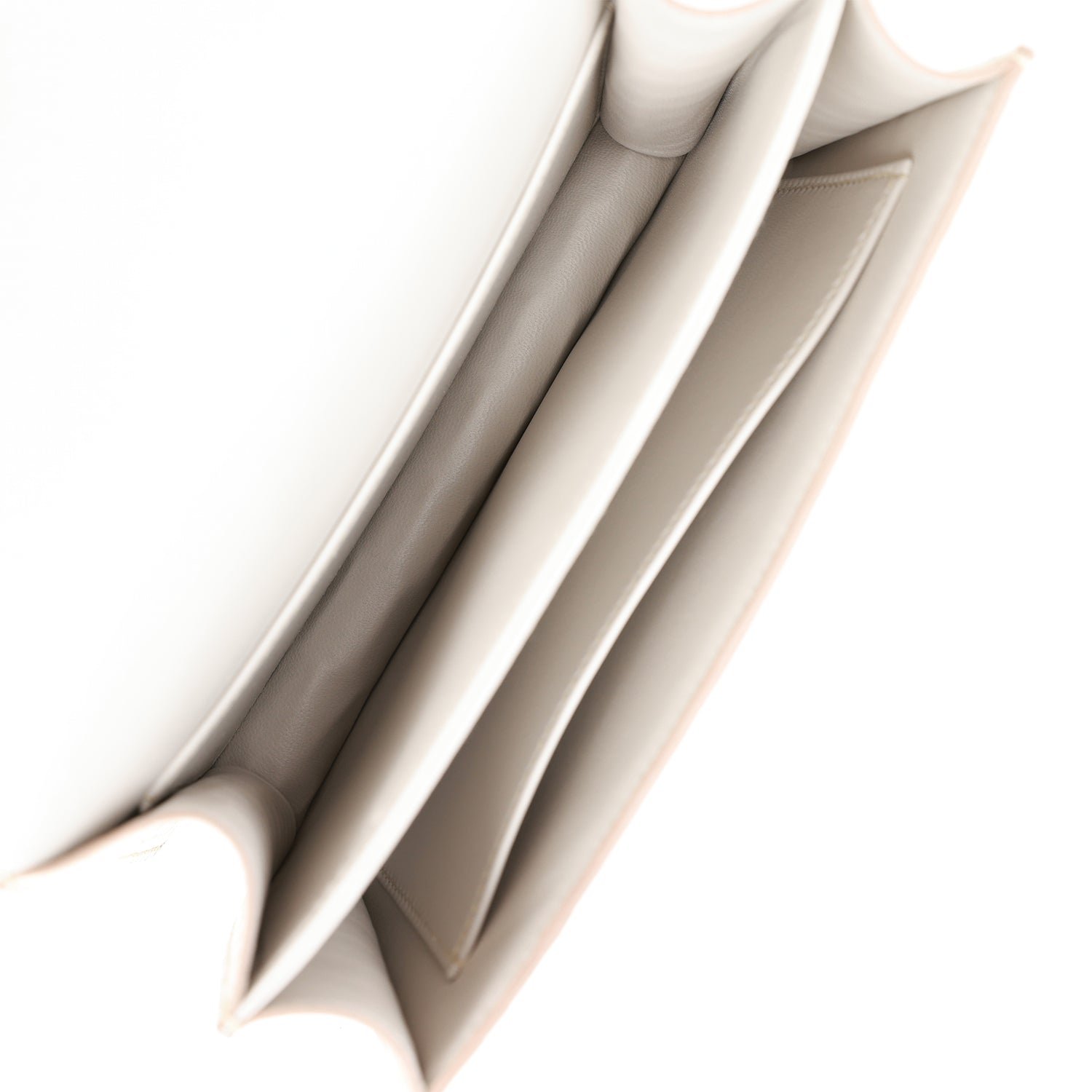 The interior is lined with Beton lambskin and has an open pocket on the front wall. a center divide. and a slit pocket on the back wall.