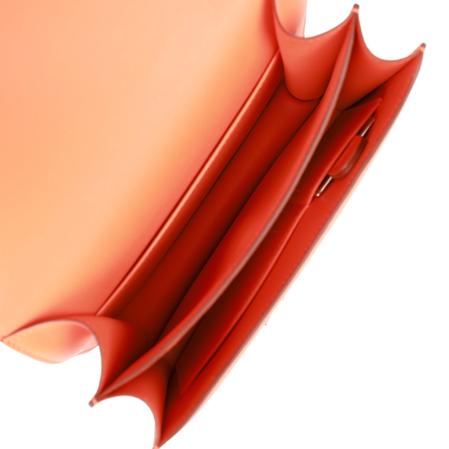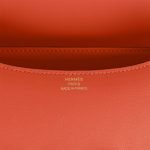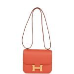 This Constance is in Orange swift leather with gold hardware and has tonal stitching. a metal H snap lock closure and adjustable shoulder strap.