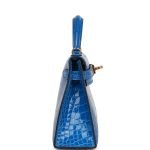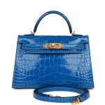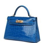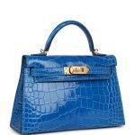 This tiny Kelly. in the Sellier style. is in Bleu Zellige shiny Mississippiensis alligator with gold hardware and has tonal stitching. two front straps with front toggle closure. single rolled handle and removable shoulder strap.