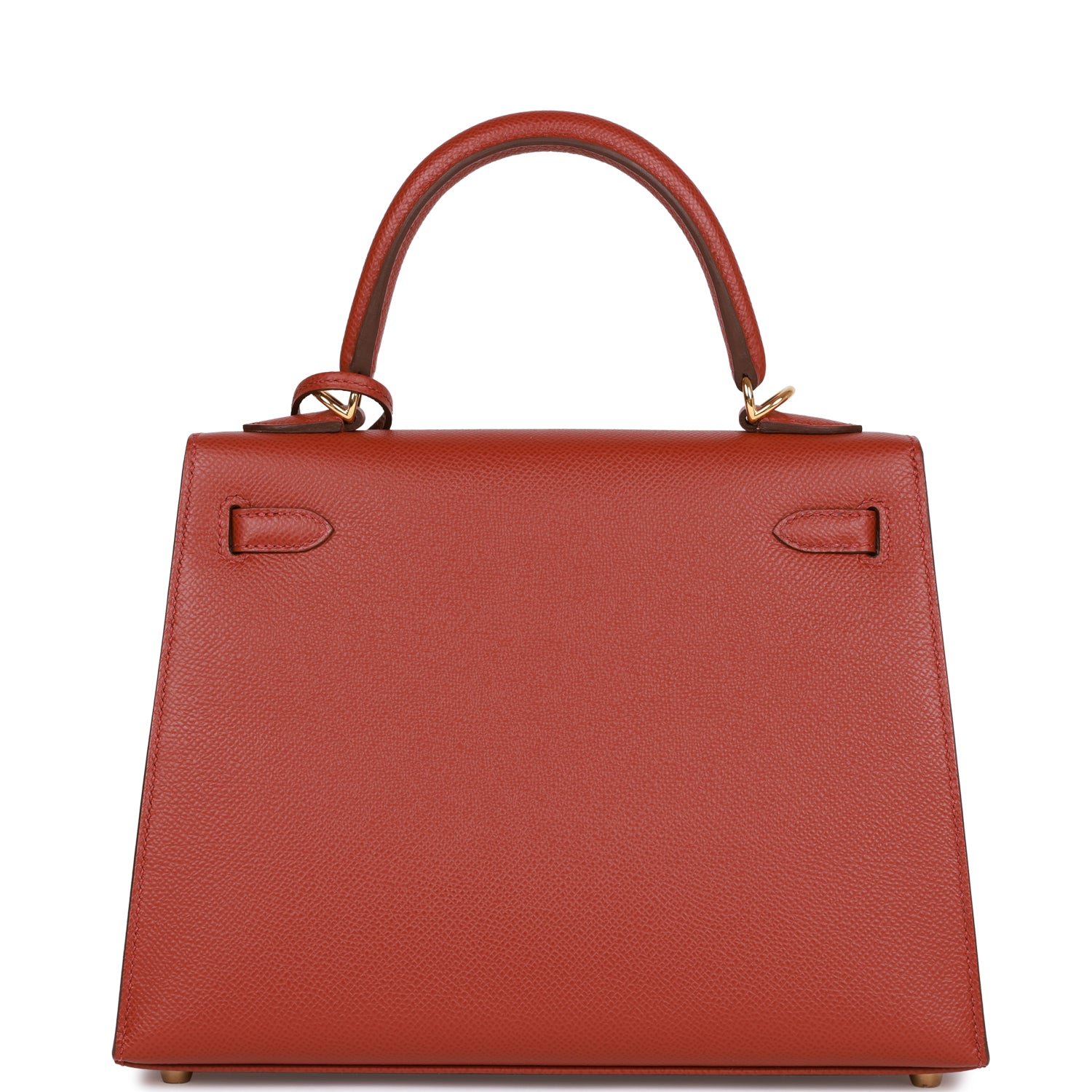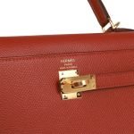 This Sellier Kelly is of Rouge Venetian epsom leather with gold hardware and has tonal stitching. front flap. two straps with center toggle closure. clochette with lock and two keys. single rolled handle and an optional shoulder strap.