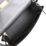 This Kelly Sellier is of black epsom leather with gold hardware and has tonal stitching. a front toggle closure. a clochette with lock and two keys. a single rolled handle and an optional shoulder strap.