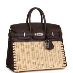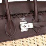 This rare Picnic Birkin Bag is in Rouge Sellier swift leather and Osier wicker with palladium plated hardware and has tonal stitching. front flap. two straps with toggle closure and double top handles.