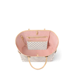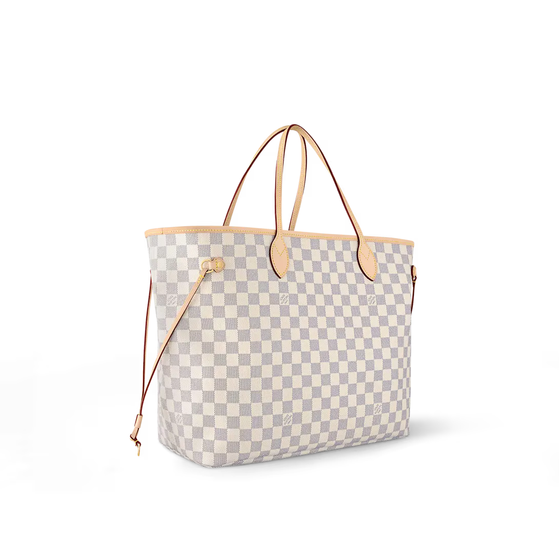 The Neverfull GM tote unites timeless design with heritage details. Crafted from fresh Damier Azur canvas with natural cowhide trim it is ultra-roomy yet never bulky with side laces that cinch for a sleek allure or loosen for a more casual look. Slim comfortable handles slip easily over the shoulder or arm. Lined in colorful textile it features a removable pouch which can serve as a clutch or an extra pocket.