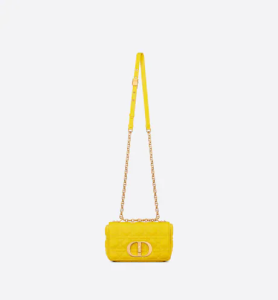 The Dior Caro bag combines modernity with timeless elegance. The design is crafted in yellow supple calfskin with Cannage stitching. The bag features a flap adorned with an antique gold-finish metal ‘CD’ twist clasp, inspired by the seal of a Christian Dior perfume bottle. The detachable chain shoulder strap with ‘CD’ signature links allows it to be carried by hand, over the shoulder or crossbody, or replaced by one of the House’s wide embroidered straps, allowing the small bag to pair with day or evening attire.